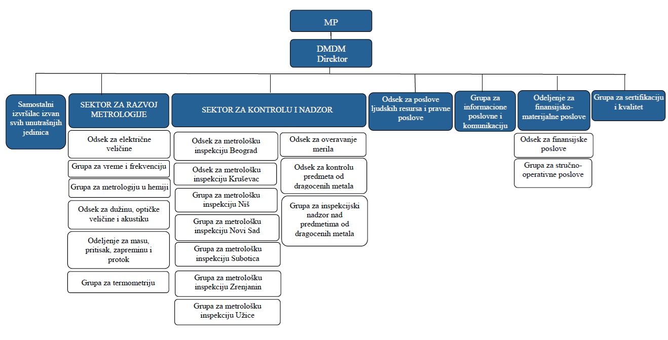 Za obavljanje poslova iz delokruga Direkcije za mere i dragocene metale, obrazuju se sledeće osnovne unutrašnje jedinice: