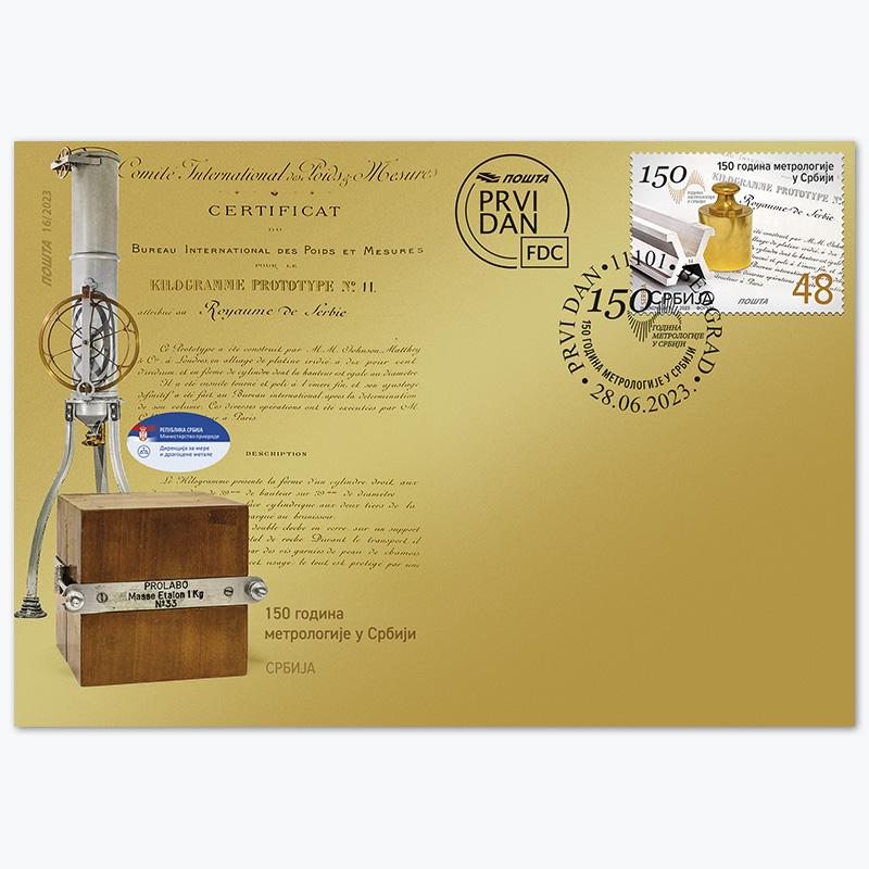 Pozadina marke i koverte prikazuje sertifikat Međunarodnog biroa za mere kojim se potvrđuje da je Кneževina Srbija dobila prototip kilogramskog tega sa rednim brojem 11.